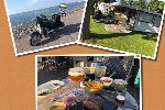 In de houten uitbouw aan de caravan is een volledig ingerichte keuken met warm en koud stromend water en o.a. een 4-pits gasstel, koelkast, magnetron, oventje, koffiezetapparaat en melkopschuimer.