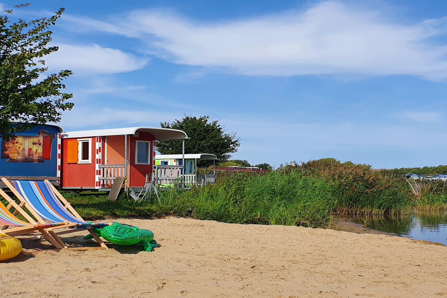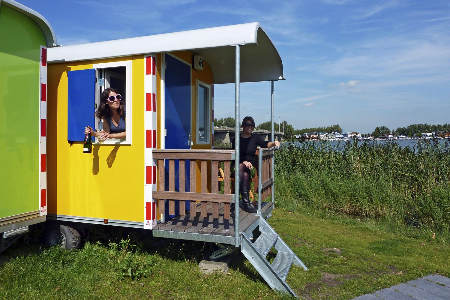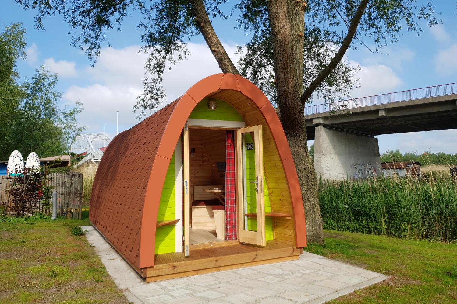 Een romantische Barrel of IJ-Pod. Duurzame Eco- cabins of een kleurrijke Wagonette met een prachtig uitzicht aan het water!