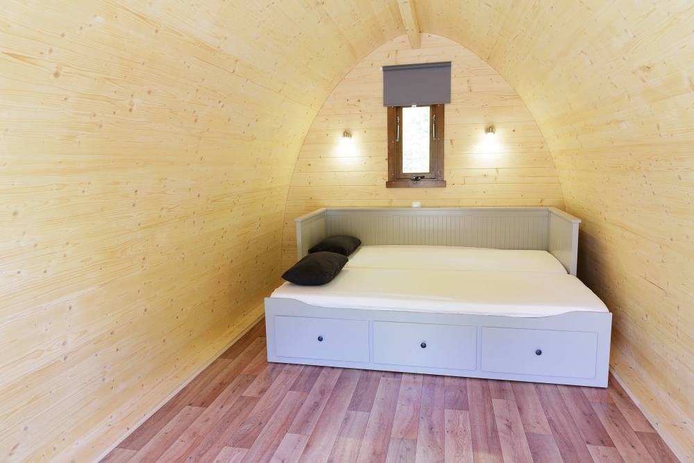 Il y a 4 lits fixes dans le Pod Luxe. 1 matelas double et 2 matelas simples simples. En outre, ce Pod est équipé d’un réfrigérateur, d’une cuisinière, de l’éclairage et d’un ensemble bistro. Vous pouvez apporter votre propre literie, mais il est également possible de louer à la réception du camping.
