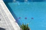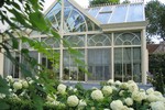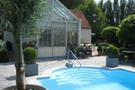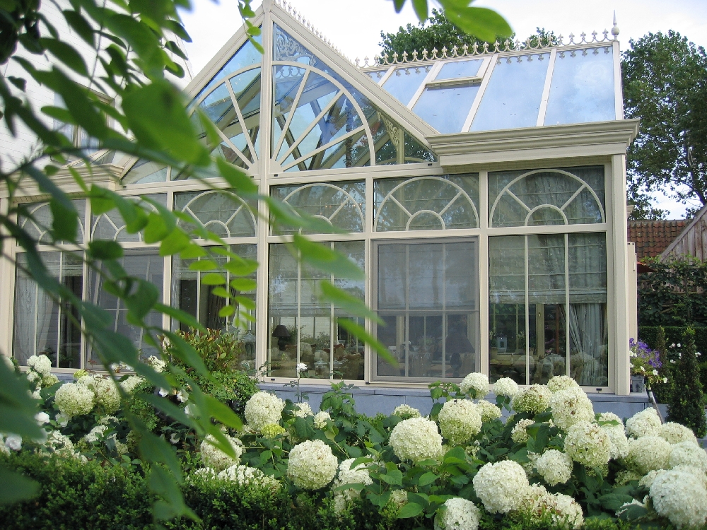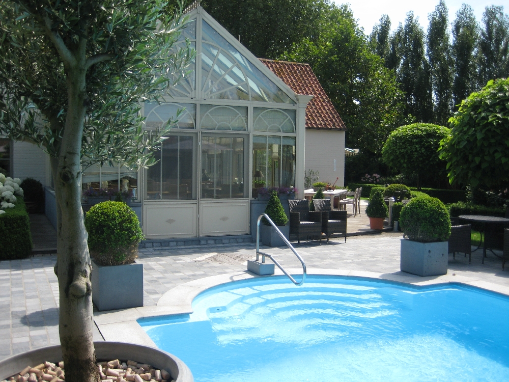 Dineren in de Orangerie met zicht op tuin en zwembad.